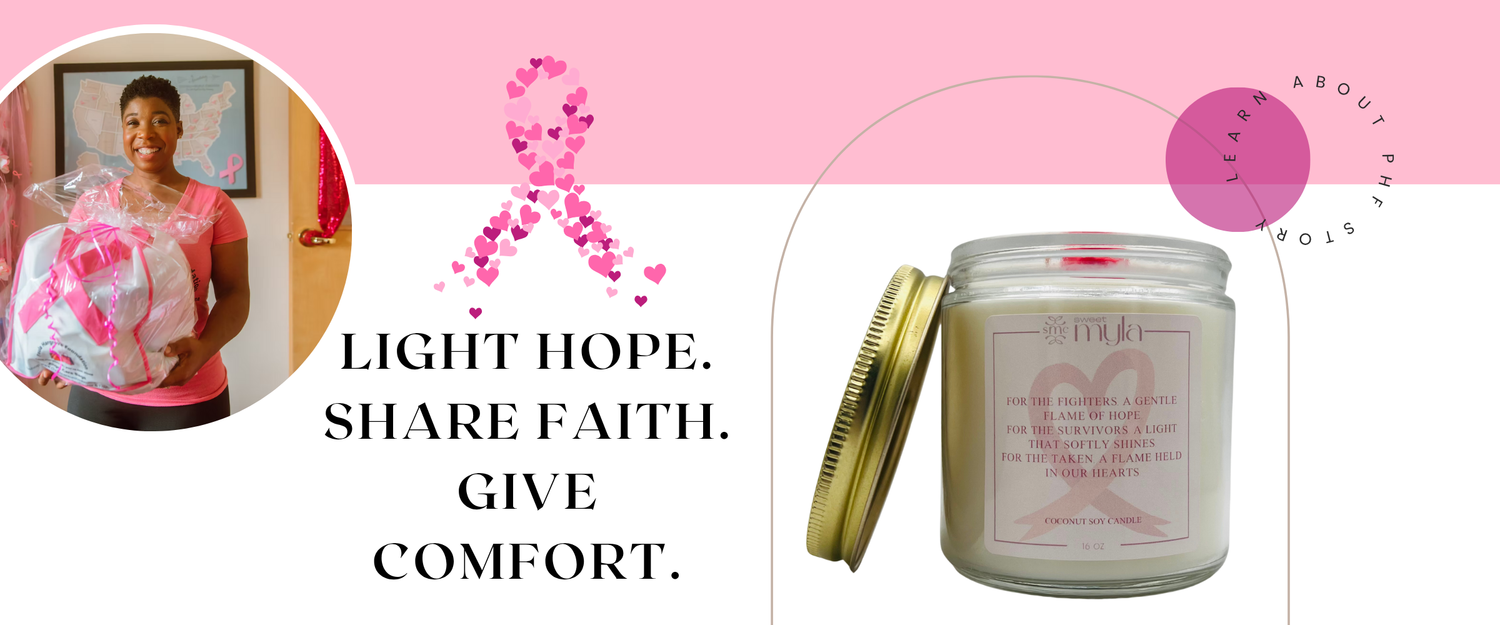 This October, your Sweet Myla purchase becomes more than a candle — it’s a beacon of hope. 30% of all proceeds will support the Paula Hargrove Foundation, providing Angel Care Bags filled with comfort and encouragement to patients receiving chemo and radiation.